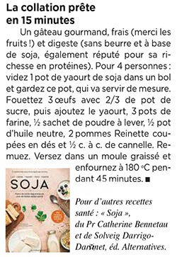 C'est la conclusion de Lorenne Korr pour sa présentation de Soja dans le trimestriel Saveurs nutrition (juillet/août/septembre). « LE MEILLEUR DU SOJA. Avec ce livre, tout devient clair. La Pr Catherine Bennetau épluche les avantages nutritionnels du soja et les précautions à prendre pour en profiter sans risques. Elle explique aussi comment appliquer tout cela côté diététique et nutrition. Lait de soja, okara, tempeh deviennent les bases de recettes savoureuses et saines. [...] ON AIME les explications scientifiques qui rassurent ; les recettes originales et succulentes, comme ces cannelés de polenta champignons- tomates séchées, ces pancakes à la crème de myrtille...»