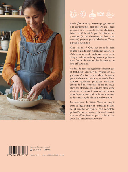 La médecine traditionnelle chinoise (MTC) pose comme fondement que l’être humain est bien plus que la somme des parties qui le composent et qu’il est un tout indivisible dans sa dimension physique, psychique et fondamentale. Pour le soigner dans ses divers dérèglements, la MTC s’appuie en grande partie sur le cycle des 5 éléments – bois, feu, métal, eau et terre – ou cycle des saisons qui s’y rapportent. La 5e saison est ce que nous appelons parfois été indien. La cuisine qui en découle, illustrée par les recettes de cet ouvrage, est créative, savoureuse, riche de sens et de goût. Elle repose exactement sur cet équilibre des éléments, usant d’ingrédients sains et complets. Elle donne une sensation d’unité, celle qu’au fond de nous-mêmes, nous recherchons tous.