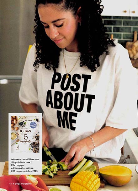 C'est le titre choisi par le bimestriel Yoga Magazine (janvier/mars) afin de présenter Mes recettes à IG bas avec 5 ingrédients max ! avec un judicieux montage de notre autrice et la couverture de son livre. Trois recettes extaites du livre sont présentées après la présentation suivante : « Dans son nouveau livre, la pionnière de l'alimentation à indice glycémique bas, Ella Hagege, nous propose des recettes élaborées avec un nombre limité d'ingrédients pour nous faciliter la vie. Résultat, moins de sucres, plus de fibres et de protéines, et la geurmandise toujours au rendez-vous. »