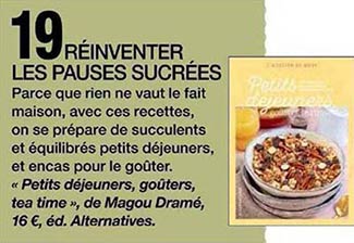 Autre article, celui paru dans le trimestriel Mieux pour moi (janvier/février/mars) : « Cheffe autodidacte et passionnée, Magou Dramé propose une cuisine du quotidien simple à préparer et délicieuse à partager. Elle a créé L'atelier de Mess sur les réseaux sociaux pour aider à changer les habitudes alimentaires du petit déjeuner au dîner. Dans Petits déjeuners, goûters, tea time, elle vous propose cinquante recettes simples et saines qui vous permettront de faire chez vous ce que beaucoup ont tendance à acheter en version industrielle [...] Le cake à la pistache de Magou Dramé devrait vous convaincre... »