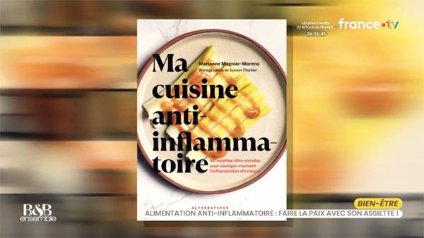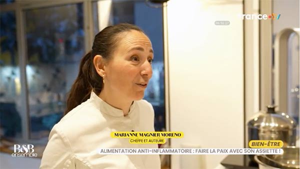 Lors de l'émission Bel & bien ensemble – ayant pour thème Alimentation anti-inflammatoire : faire la paix avec son assiette – présentée par Agathe Lecaron sur France 2 et France.TV, Marianne Magnier-Moreno a été interviewée dans le lieu parisien où elle donne des cours de cuisine pour expliquer tous les bienfaits des recettes que l'on trouve dans son livre Ma cuisine anti-inflammatoire. « Des conseils qui permettent de repenser sa façon de manger. Dans la cuisine de Marianne, il n'y a pas d'injonction, tout n'est pas à retirer d'un coup. ». L'intégralité du reportage est à découvrir en cliquant ici entre 19'30" et 24'15".