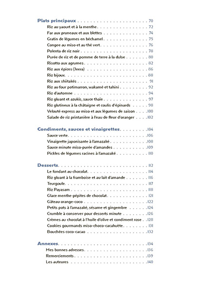 50 recettes végétariennes d’ici et d’ailleursDe la carte des riz du monde – rouge, blanc, noir, rond, long, basmati… – à leur mode de cuisson spécifique – pilaf, à l’étouffée, à la vapeur, grillé… – en passant par les monodiètes ou les plats santé des lendemains de fête, vous saurez tout sur cet aliment de base, naturellement sans gluten, aux infinies possibilités culinaires et aux trésors nutritifs incontestables. Félicie Toczé livre ici plus de 50 recettes salées et sucrées végétariennes, glanées au fil de ses voyages, qui mettent à l’honneur cette céréale très digeste dont les plus anciennes traces remontent à 5 000 ans avant J.-C. en Chine.