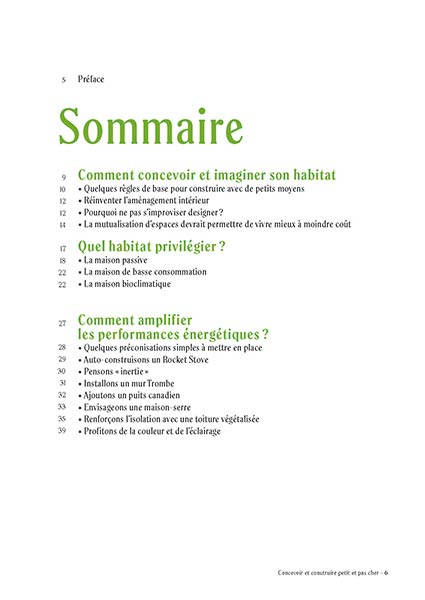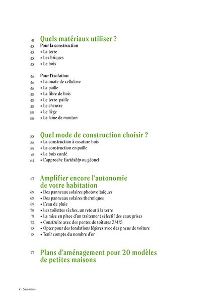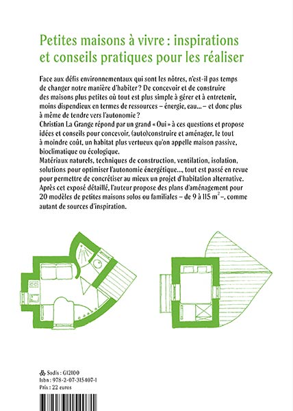Plans d'aménagement pour 20 petites maisonsFace aux défis environnementaux qui sont les nôtres, n’est-il pas temps de changer notre manière d’habiter ? De concevoir et de construire des maisons plus petites où tout est plus simple à gérer et à entretenir, moins dispendieux en termes de ressources – énergie, eau... – et donc plus à même de tendre vers l’autonomie ? Christian La Grange répond par un grand « Oui » à ces questions et propose idées et conseils pour concevoir, (auto)construire et aménager, le tout à moindre coût, cet habitat plus vertueux qu’on appelle maison passive, bioclimatique ou écologique. Matériaux naturels, techniques de construction, ventilation, isolation, solutions de chauffage, récupération des eaux de pluie, toilettes sèches..., tout est passé en revue pour permettre de concrétiser au mieux un projet d’habitation alternative. Après cet exposé détaillé, l’auteur propose des plans d’aménagement et des perspectives pour 20 petites maisons solos ou familiales – de 9 à 90 m2 –, comme autant de sources d’inspiration.