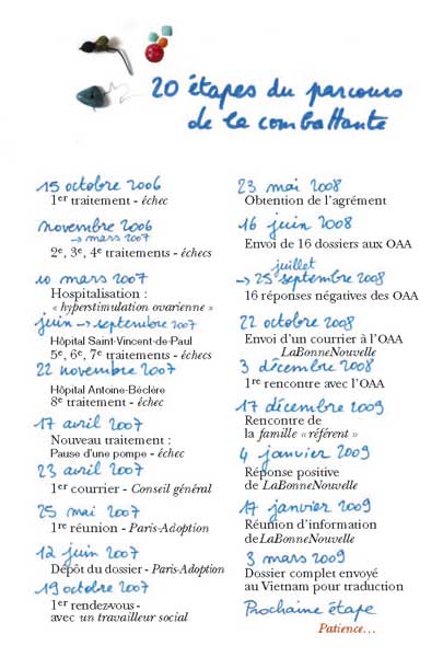 En France, environ 30 000 personnes attendent de pouvoir adopter quand moins de 4 000 enfants le sont chaque année. Autant de parcours de vie où le désir d’enfant se heurte de plein fouet à des démarches éreintantes et des espoirs sans cesse contrariés. Le journal de Coco Tassel raconte son itinéraire d’adoptante en mots et en images, loin de tout pathos mais plein d’émotion. Une histoire où se reconnaîtront sans doute de nombreux partants pour l’Adoptie, ce pays plein d’enfants en attente de parents. Avec des informations pratiques et d’actualité, des cartes, des chiffres…